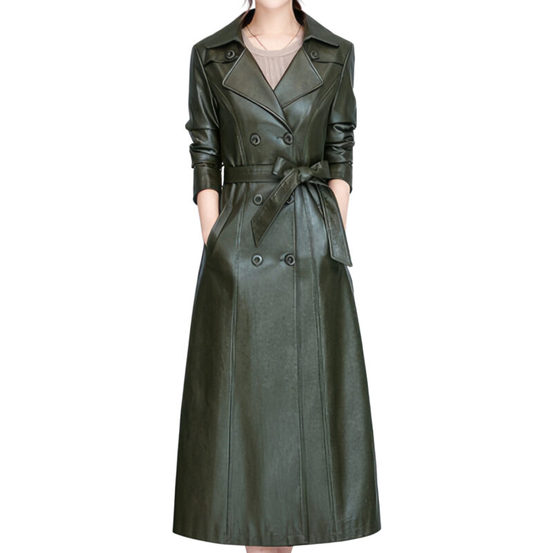 Elevate your wardrobe with our Women’s Army Green Genuine Sheepskin Leather Trench Coat. Skillfully crafted from top-notch sheepskin leather, this coat ensures lasting quality and a sophisticated touch. The stylish lapel collar pairs perfectly with the double-breasted button and belt closure, creating an elegant silhouette. Its long-length design offers exceptional coverage, making it a valuable addition to your cold-weather collection. The coat also includes practical side waist pockets, blending style and utility. Whether you’re headed to the office or a casual outing, this coat guarantees a classy look.