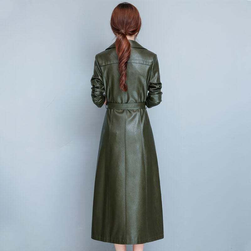 Army Green Double Breasted Elegant Belted Leather Trench Coat