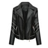 Women’s Black Racer Genuine Sheepskin White Stripes Asymmetric Motorcycle Café Racer Slim Fit Sporty Leather Jacket exudes rebellious appeal. This jacket is made of excellent sheepskin leather and has an inside viscose lining for long-lasting use and optimal comfort. The distinct white stripes give a sporty element, while the asymmetric YKK zipper closing combines design and functionality. The jacket also has zipper closure pockets, which are useful for storing small items. This leather jacket is a flexible addition to your collection, whether you’re trying for a moto café racer vibe or a slim cut sports style.