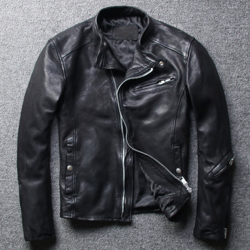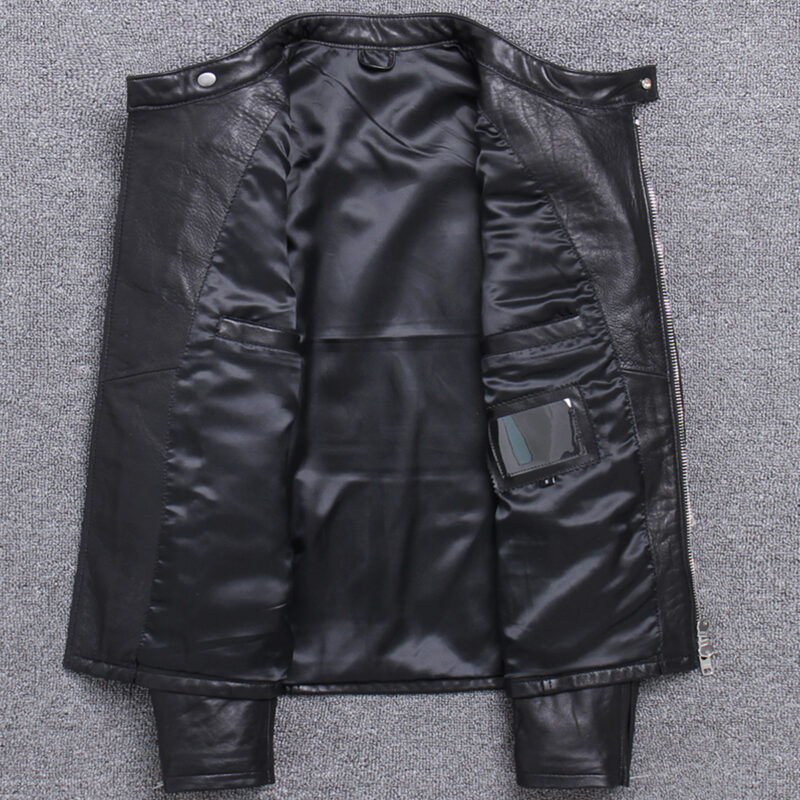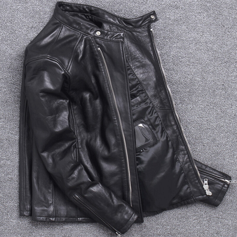 Introducing the Men’s Black Biker Crossover Genuine Sheepskin Stand Collar Asymmetric Fashion Slim Fit Motorcycle Rider Leather Jacket – a perfect combination of style, comfort, and function. Crafted from high-quality genuine sheepskin leather and featuring a soft inner viscose lining, this jacket provides all-season comfort. The stand collar and asymmetric front closure create a unique and bold fashion statement, while the reliable YKK zipper ensures durability. Multiple pockets offer ample storage for your essentials, and the slim fit, style highlights your rugged charm and confidence. Elevate your wardrobe with this expertly designed motorcycle rider jacket.