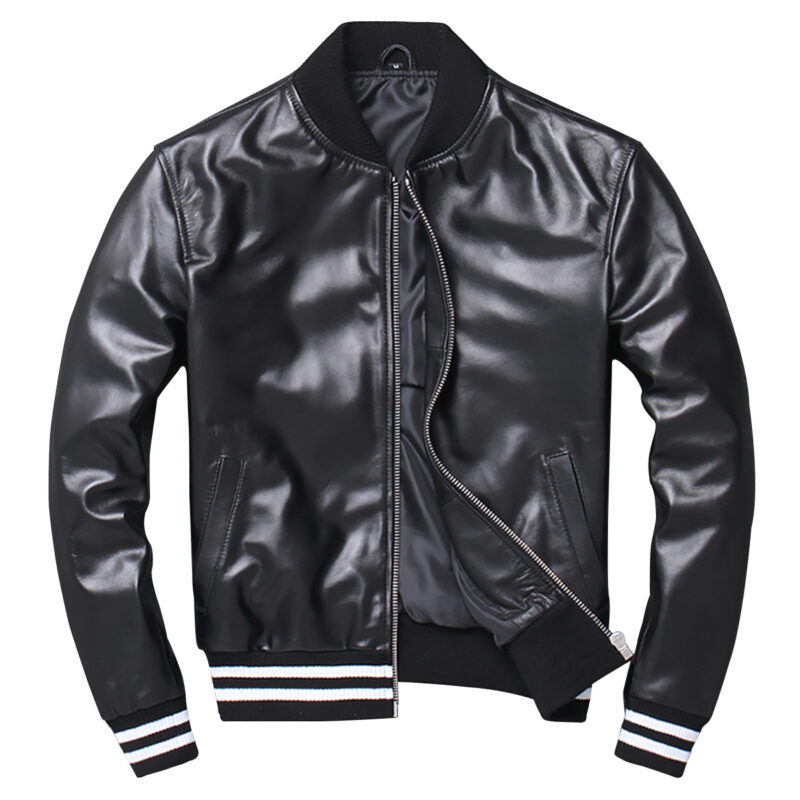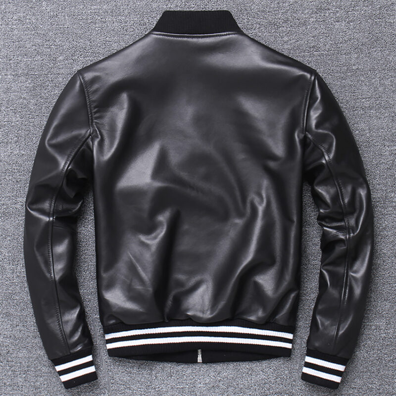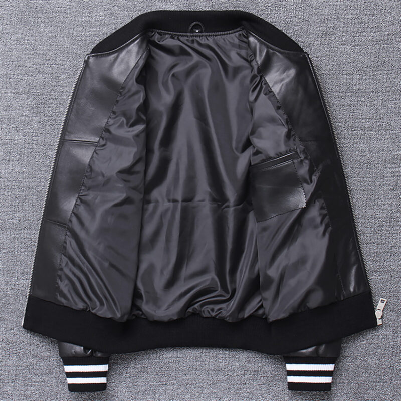 - Genuine Sheepskin & Inner Viscose Lining: Our Men’s Black Baseball Bomber Leather Jacket Is Crafted From High-Quality Genuine Sheepskin, Featuring A Comfortable Inner Viscose Lining For Added Breathability And Warmth.