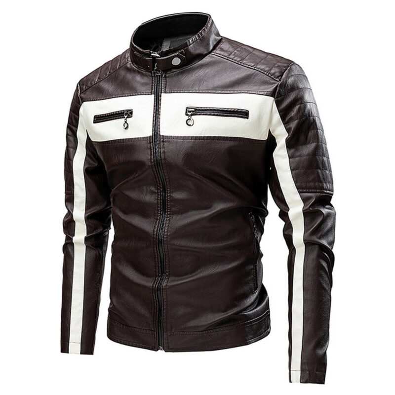 Men’s Brown Biker Real Sheepskin Stand Collar Quilted Shoulder Striped Motorcycle Café Racer Smooth Sporty Leather Jacket will up your style game. This jacket is made of high-quality Real sheepskin leather and has a soft inner viscose lining for unrivaled comfort and warmth. The superior YKK zipper clasp provides durability and safe latching, while the stand collar and quilted shoulders offer a sophisticated and stylish touch. This traditional motorcycle jacket has a modern and fashionable edge thanks to the white stripe design on the sleeves and chest. Elevate your style with this stylish and athletic leather jacket, which is guaranteed to raise attention wherever you go.