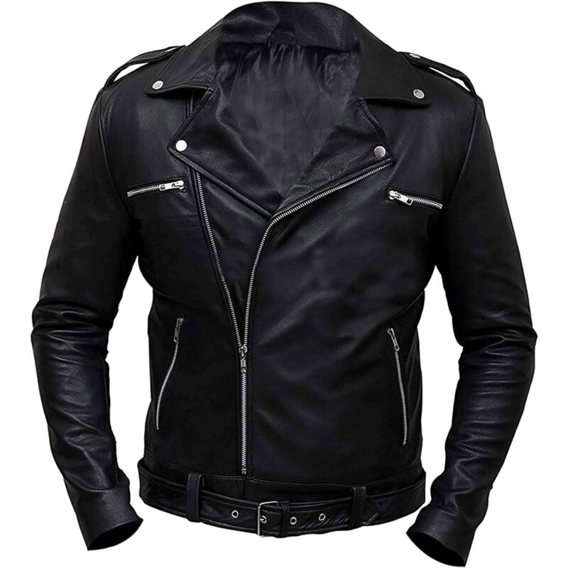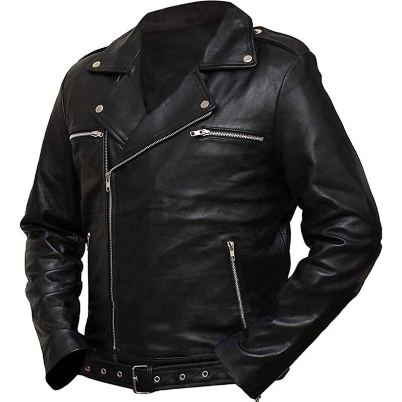 This classic Negan leather jacket for men is designed with an asymmetrical zipper to give the wearer a sleek, modern appearance. The jackets vintage lapel collar and minimalist design lend it an air of sophistication that can be dressed up or down, making it perfect for any occasion. The premium leather construction ensures both durability and comfort, while the black color gives it a classic, timeless feel. The jackets Cafe Racer style influences make it an excellent choice for men who value fashion and practicality, making it a versatile and stylish addition to any wardrobe.