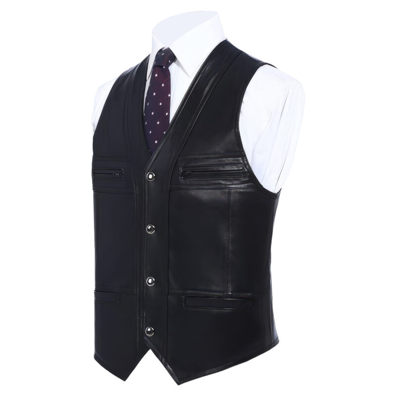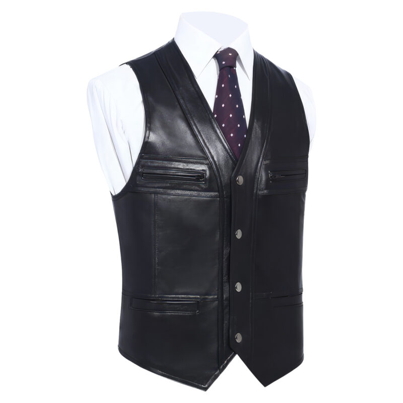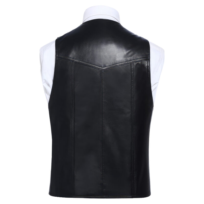 Effortlessly blend sophistication and style with this Men?s Black Genuine Sheepskin Leather Waistcoat. Made from high-quality sheepskin leather, it offers an exceptional level of comfort and durability. The sleek design features a v-neck and slim fit, enhancing your figure while providing a classy look. The waistcoat includes a secure button closure and multiple pockets for practical use. Its sleeveless design offers versatility, making it perfect for warmer weather or for layering under jackets during cooler months. Elevate your wardrobe with this elegant piece.