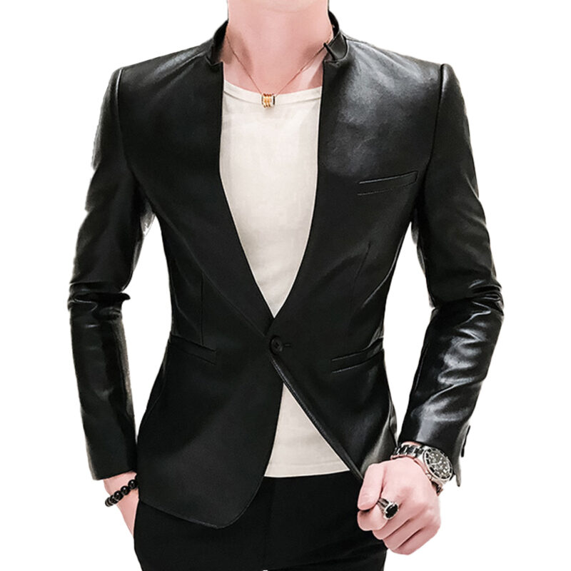 Men’s Black Genuine Sheepskin Stand Collar Casual Office Business Leather Blazer