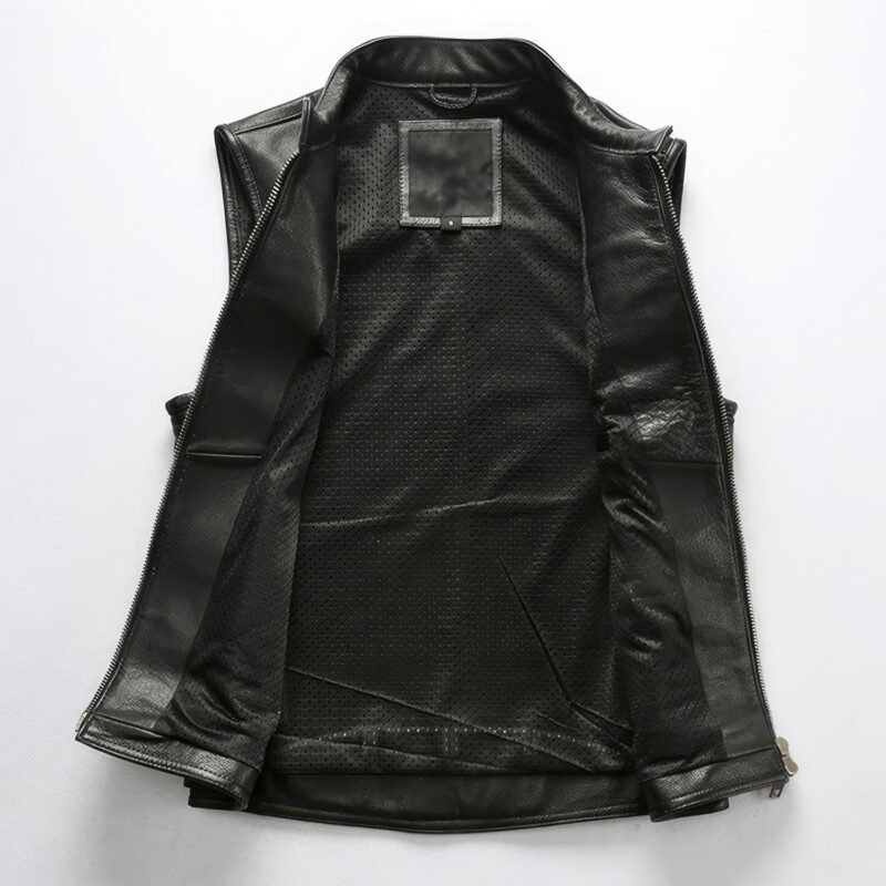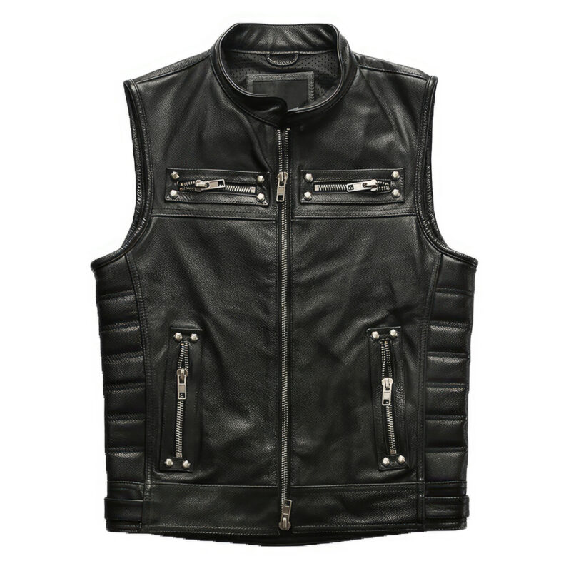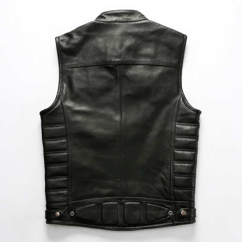Step into style with our Men’s Smooth Black Biker Genuine Cowhide Sleeveless Vest. Crafted from high-quality cowhide leather, this vest offers a blend of durability and luxury that’s tough to beat. The design elements include a trendy stand collar and a unique waist side quilted design, both contributing to a sophisticated biker aesthetic. Thanks to the reliable YKK one-way zipper, you’ll enjoy a secure and comfortable fit every time you put it on. The vest comes complete with multiple pockets, providing ample space for your belongings. Lightweight and slim-fitting, this vest is suitable for various occasions, making it an essential addition to your wardrobe. Whether you’re on a motorcycle adventure or out for a casual gathering, this vest will keep you looking sharp and feeling comfortable.