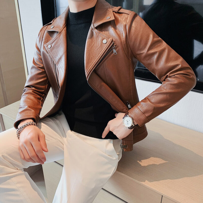 - Moto-Inspired Style: Tailored for men, this jacket boasts a moto-inspired design with an asymmetric layout and a lapel collar.