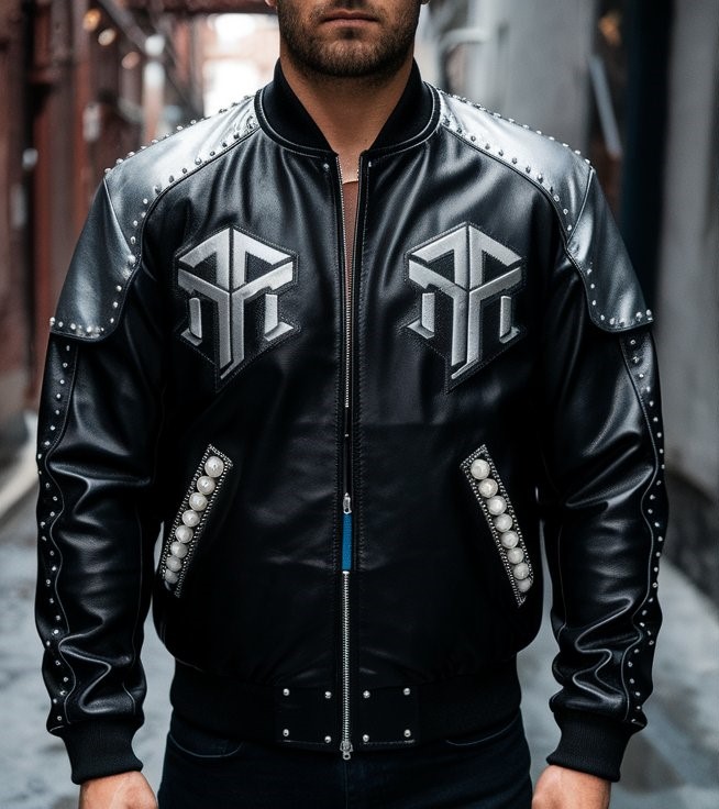 Black Leather Bomber Jacket with Metallic Accents: This black leather bomber jacket is designed with metallic silver accents, showcasing a modern embroidered logo on the left chest and “Rapstern” in a bold font on the right. Small studs along the arm seams and collar enhance its edgy appeal. The back features a large embroidered ‘Rapstern’ logo surrounded by rays and abstract shapes, reflecting the dynamic essence of urban culture.