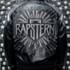 - Outer Material: Black leather, Inner Material: Smooth lining, Collar: Classic collar, Closure: Central zipper, Cuffs: Ribbed cuffs, Sleeves: Long sleeves with stud details, Pockets: Two side pockets, Color: Black with metallic silver accents, Graphics: Modern embroidered logo in metallic silver, “Rapstern” in bold font, large embroidered logo on the back surrounded by rays and abstract shapes.