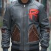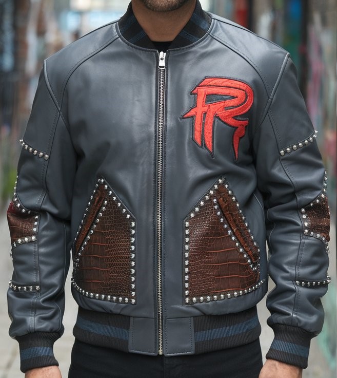 Tags: Bold Hip-Hop Jacket, Charcoal Leather Jacket, Crocodile Leather Accents, Dynamic Leather Jacket, Metallic Studs Bomber, Phoenix Embroidery, Rapstern Collection, Silver Studded Jacket, Statement Bomber Jacket, Streetwear Urban Jacket, Urban Street Fashion