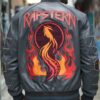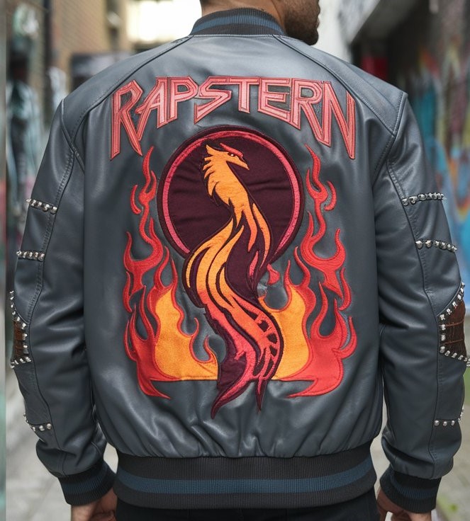 Charcoal Gray Leather Bomber Jacket: This charcoal gray leather bomber jacket is crafted with mixed materials, showcasing a modern embroidered logo in vibrant red on the left chest and “Rapstern” in bold font on the right. With a sturdy central zipper, ribbed cuffs, and a fitted hem, the jacket merges style and comfort. The back features a large embroidered design of a stylized phoenix surrounded by flames, adding a unique touch to the urban aesthetic.
