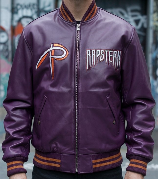 Description: Embrace the festive spirit with the Rapstern Haunted Spirit Bomber Jacket. This deep purple leather jacket features a striking modern embroidered logo in white and orange, with the name “Rapstern” prominently displayed. The back showcases a large, detailed ghost figure, surrounded by Halloween elements like pumpkins and bats, perfectly suited for those who love hip-hop culture and vibrant street style. Ideal for urban nights out, this jacket is a must-have for any trendy wardrobe.