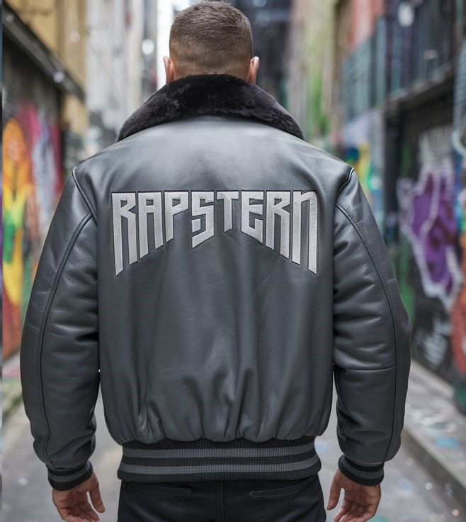 Description: Elevate your outerwear collection with the Rapstern Phoenix Rise Leather Bomber Jacket. This charcoal gray jacket features a vibrant red embroidered logo on the left chest and the name “Rapstern” on the right. The back is adorned with a stylized phoenix design, surrounded by flames and metallic studs, making it a standout piece for anyone who loves urban street style. This jacket is perfect for expressing individuality and flair in any setting.