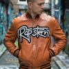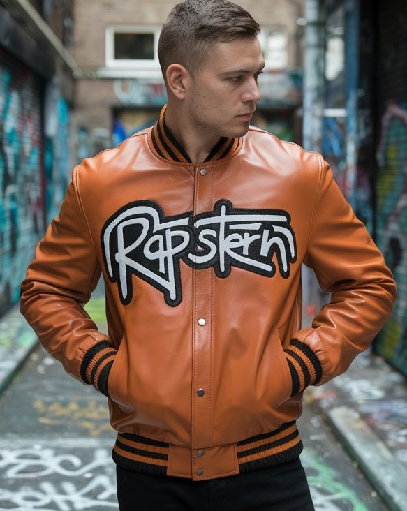 Description: Step into the spotlight with the Rapstern Skull Leaf Hip-Hop Jacket. This eye-catching leather bomber jacket in vibrant orange features a playful embroidered logo in black and white. The back showcases a spooky skull partially obscured by a vibrant yellow leaf, surrounded by roses and intricate spider web details. Perfect for fans of urban streetwear, this jacket captures the essence of modern hip-hop style with its bold colors and designs.