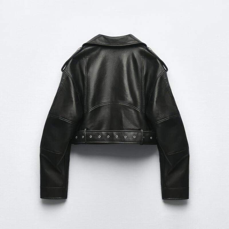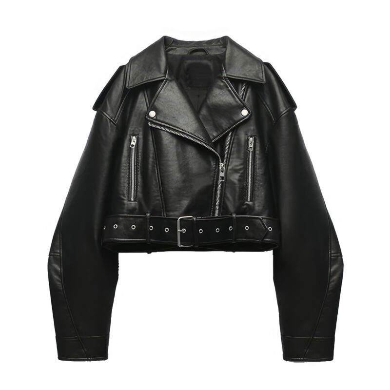 Discover the Women’s Biker Black Genuine Sheepskin Sporty Casual Moto Biker Lapel Collar Café Racer Streetwear Loose Asymmetric Leather Jacket – the perfect combination of fashion, comfort, and workmanship. This jacket is made of sumptuous real sheepskin and has a high-quality polish for long-lasting usage. The lightweight viscose lining provides breathability and comfort, while the unique lapel collar lends a touch of elegance to the sporty style. The adjustable waist belt allows for a tailored fit, while the dependable YKK zippers ensure smooth closure and longevity. Make a fashion statement with this eye-catching, Streetwear-inspired asymmetric leather jacket, ideal for everyday wear or your next exhilarating café racer ride.