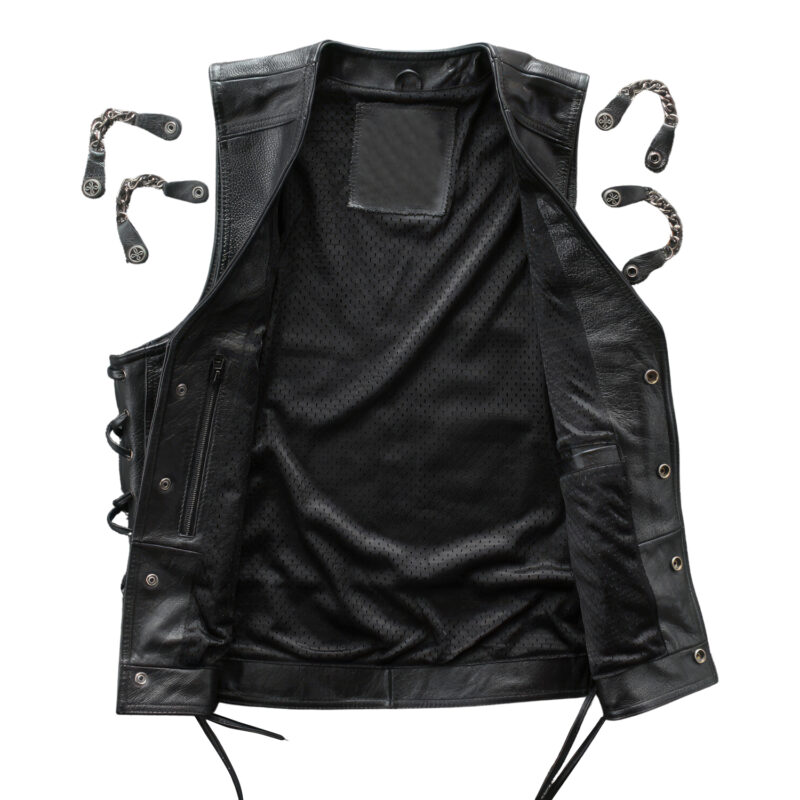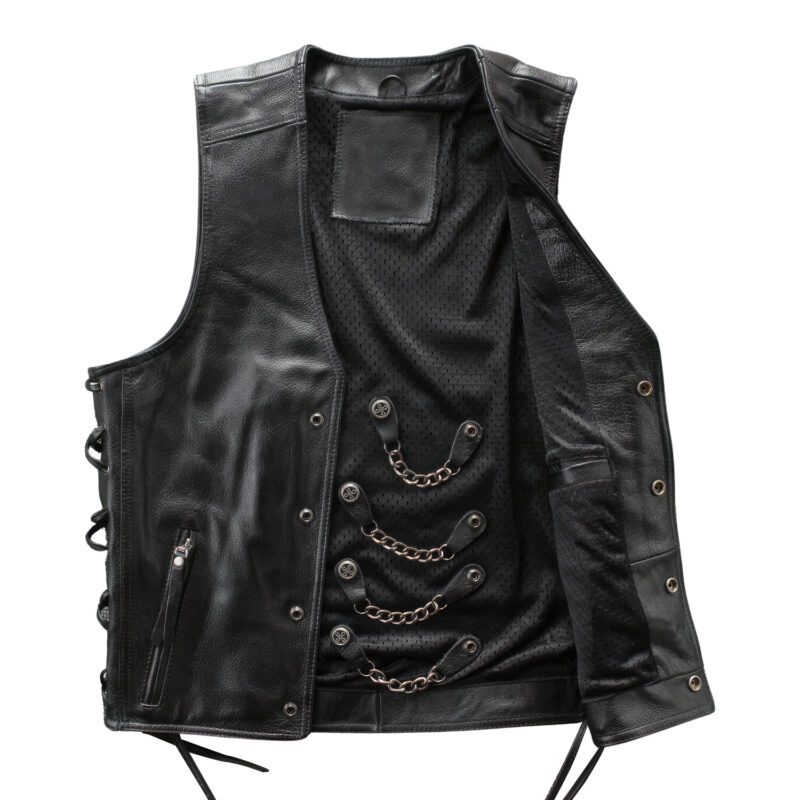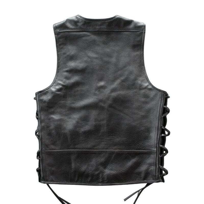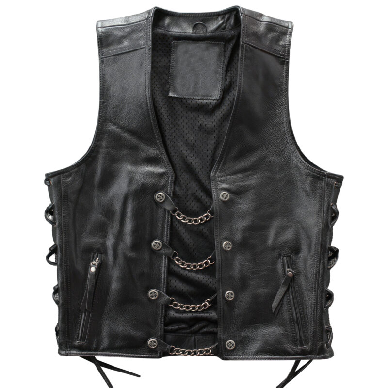 This Men’s Biker Waistcoat offers an edgy and stylish look with a punk touch. Crafted from top-quality genuine sheepskin leather, it features unique lace-up sides for an adjustable fit and a classic V-neck design to enhance your style quotient. The robust snap button and chain closure, along with practical waist pockets, make this a perfect blend of form and function. Embrace the Streetwear trend with this trendy motorcycle waistcoat, perfect for a bold fashion statement.