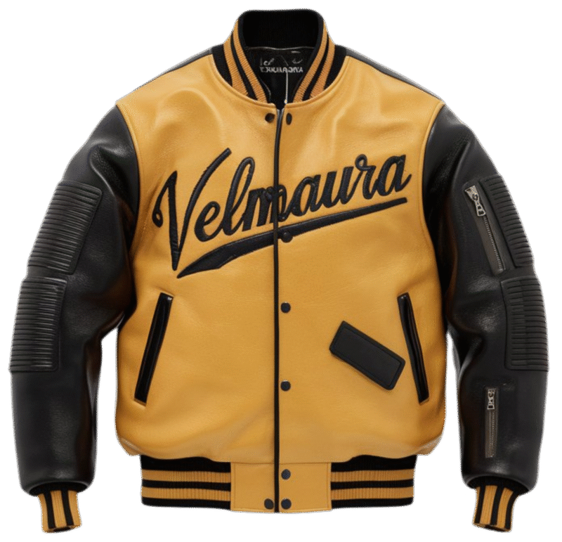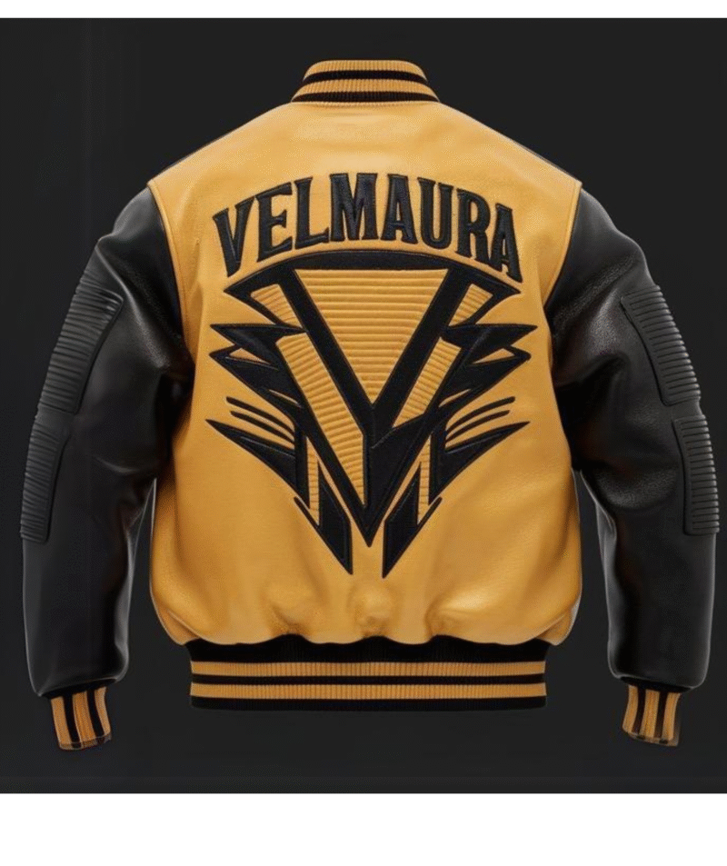 Introducing the Velmaura Blaze Yellow and Black Leather Jacket, a standout piece that combines vibrant colors with striking design elements. This high-quality jacket features a vibrant yellow leather main body with “Velmaura” embroidered in black using a modern font on the front. The black leather sleeves provide a striking contrast, while a dynamic logo with bold graphics is prominently displayed. The jacket includes black hardware and ribbed cuffs and hem, adding to its sleek and stylish appearance. The back view showcases a bold graphic design or emblem with “Velmaura” creatively integrated, emphasizing the jacket’s unique and eye-catching appeal.