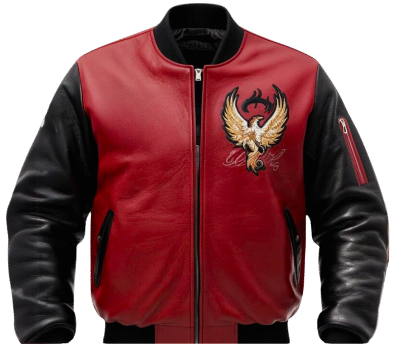 This custom leather bomber jacket exudes elegance and symbolism with its embroidered phoenix motifs, celebrating resilience and rebirth. The intricate craftsmanship and thoughtful use of colors and cityscape elements make it a standout piece, embodying both urban sophistication and timeless style.