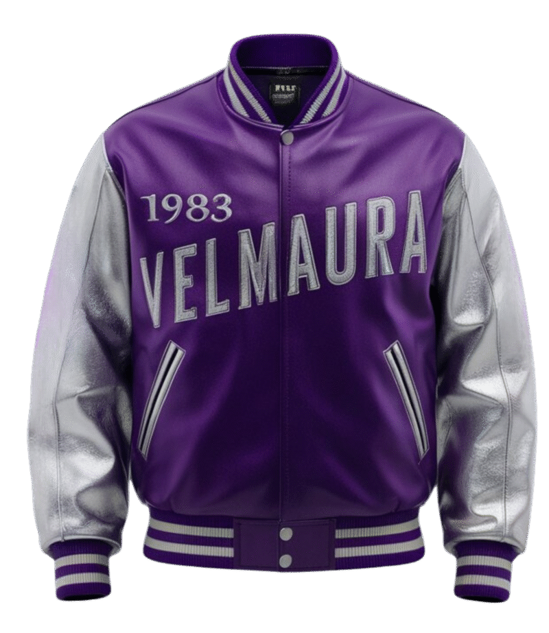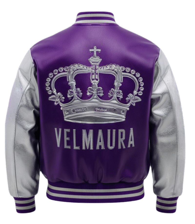 Introducing the Velmaura Regal Crown Purple and Silver Leather Jacket, a luxurious and stylish addition to any wardrobe. This high-quality jacket features a stunning purple main body with “Velmaura” text in silver outlined in purple on the front, accompanied by a crown logo and the number “1983” prominently displayed. The silver sleeves add an elegant contrast, while the silver zipper, ribbed cuffs, and hem with purple and silver stripes complete the look. The back view showcases a large silver crown with “Velmaura” written in purple, enhancing the jacket’s regal and sophisticated appearance. This jacket blends fashion and luxury, making it a unique and eye-catching piece.