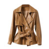 Women’s Brown Genuine Sheepskin Lapel Collar Korean Version Casual Belted Slim Fit Autumn Spring Leather Jacket can elevate your look. This jacket is made of high-quality sheepskin and has a fashionable lapel collar as well as a secure snap button and belted fastening. The double-breasted style adds to the traditional look, while the thin fit and belted waist create a flattering profile. This jacket is perfect for both informal and formal situations and is a great addition to your wardrobe for the fall and spring seasons. It strikes the ideal blend of warmth, comfort, and elegance.