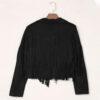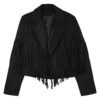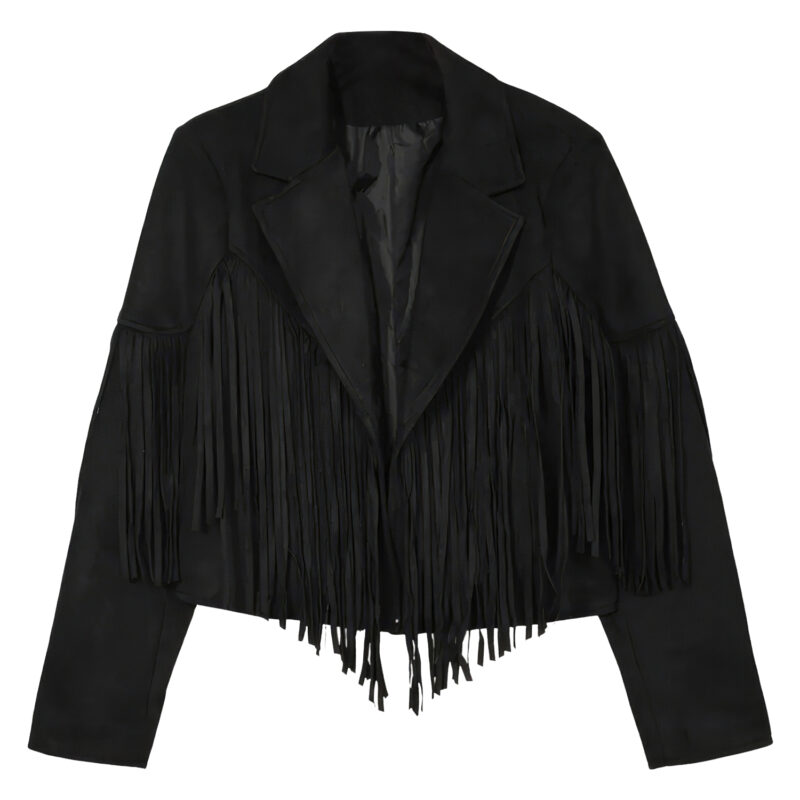 With this Women’s Black Genuine Suede Tassel Lapel Long Sleeve Motor Biker Native American Vintage Cropped Leather Jacket, you may embrace your inner fashionista. This jacket is made of fine suede leather and is both comfortable and elegant. The eye-catching tassel pattern is inspired by Native American culture, and the cropped style emphasizes your silhouette. The traditional lapel collar and long sleeves lend this garment adaptability for a wide range of settings, from casual excursions to evenings on the town. This gorgeous and trendy leather jacket will add a touch of class to your collection.